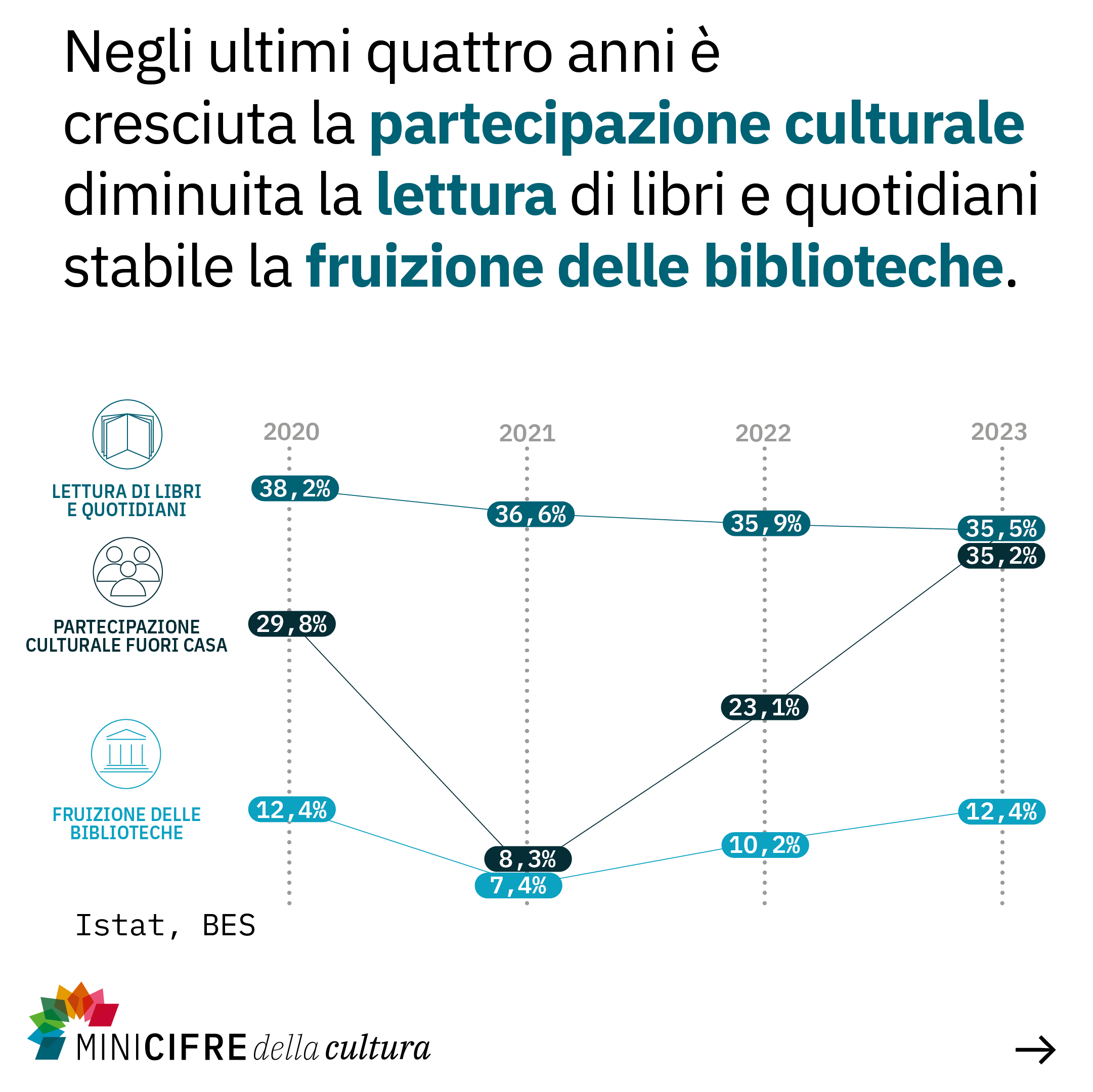 Tra 2020 e 2023, con il progressivo attenuarsi dell’emergenza sanitaria, è tornata a crescere la partecipazione culturale dei cittadini fuori casa (dal 29,8% al 35,2%), raggiungendo livelli di poco superiori rispetto al periodo pre-pandemico (35,1% nel 2019). Trend opposto per il tasso di lettura di libri e quotidiani, calato, tra 2020 e 2023, dal 38,2% al 35,5%, mentre si mantiene stabile al 12,4% il livello di fruizione delle biblioteche nel 2023.