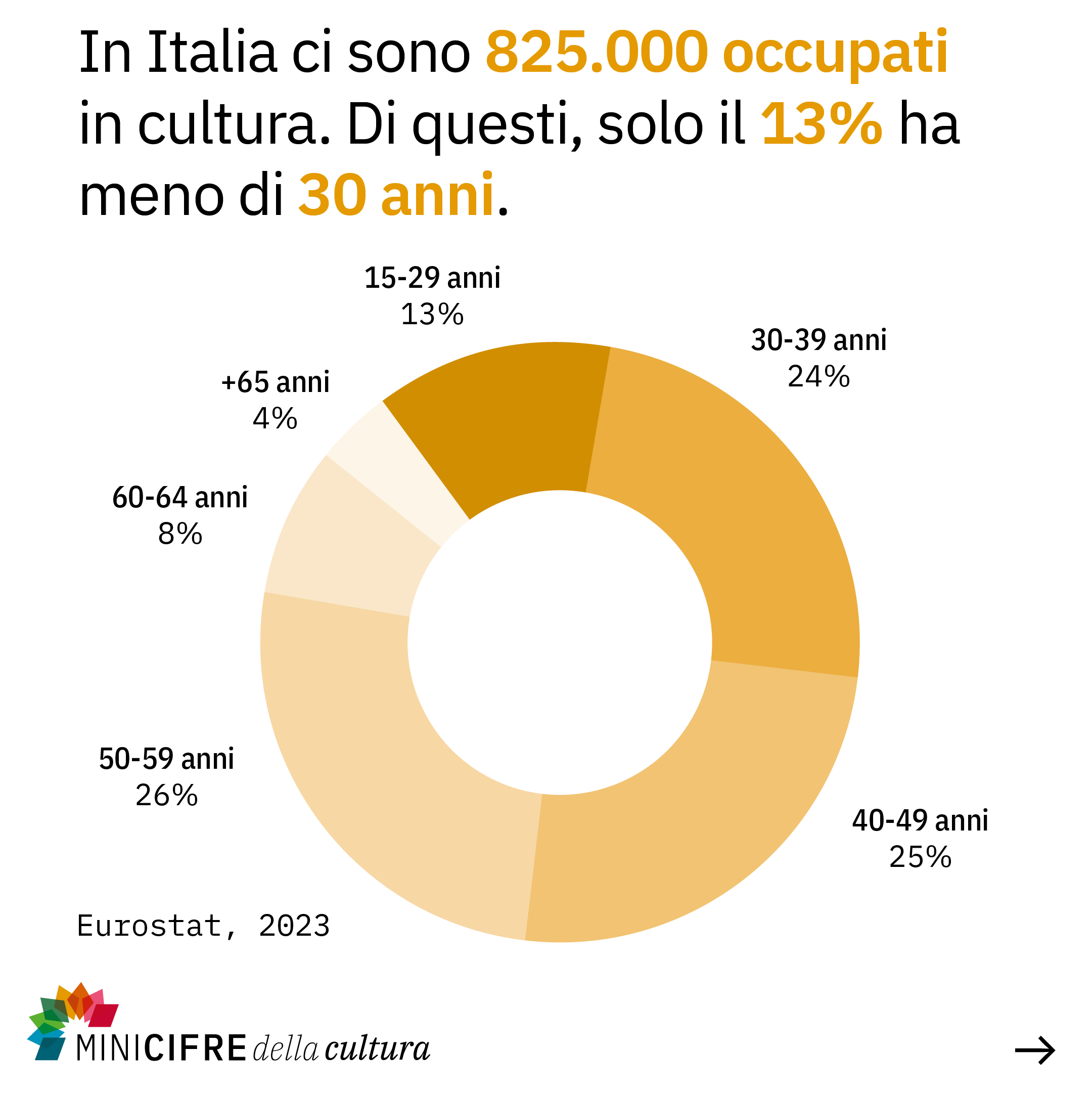 Secondo la European Union labour force survey, indagine condotta da Eurostat, nel 2023 sono 825.100 i lavoratori occupati nel nostro Paese nel settore culturale, una cifra che equivale a circa il 3,5% del numero complessivo di occupati a livello nazionale. Si tratta per la maggior parte di lavoratori di sesso maschile (55%) e che ricadono, in tre casi su quattro, in una fascia d’età compresa tra i 30 e i 59 anni. Gli occupati d’età inferiore ai 30 anni rappresentano, infatti, solo il 13% del totale, pur essendo aumentati del 21% dal 2021. Prendendo in considerazione il triennio 2021-2023, è possibile osservare un lieve incremento degli occupati nel settore (+7%), il cui numero risulta pressoché allineato ai livelli rilevati nel periodo pre-pandemico.