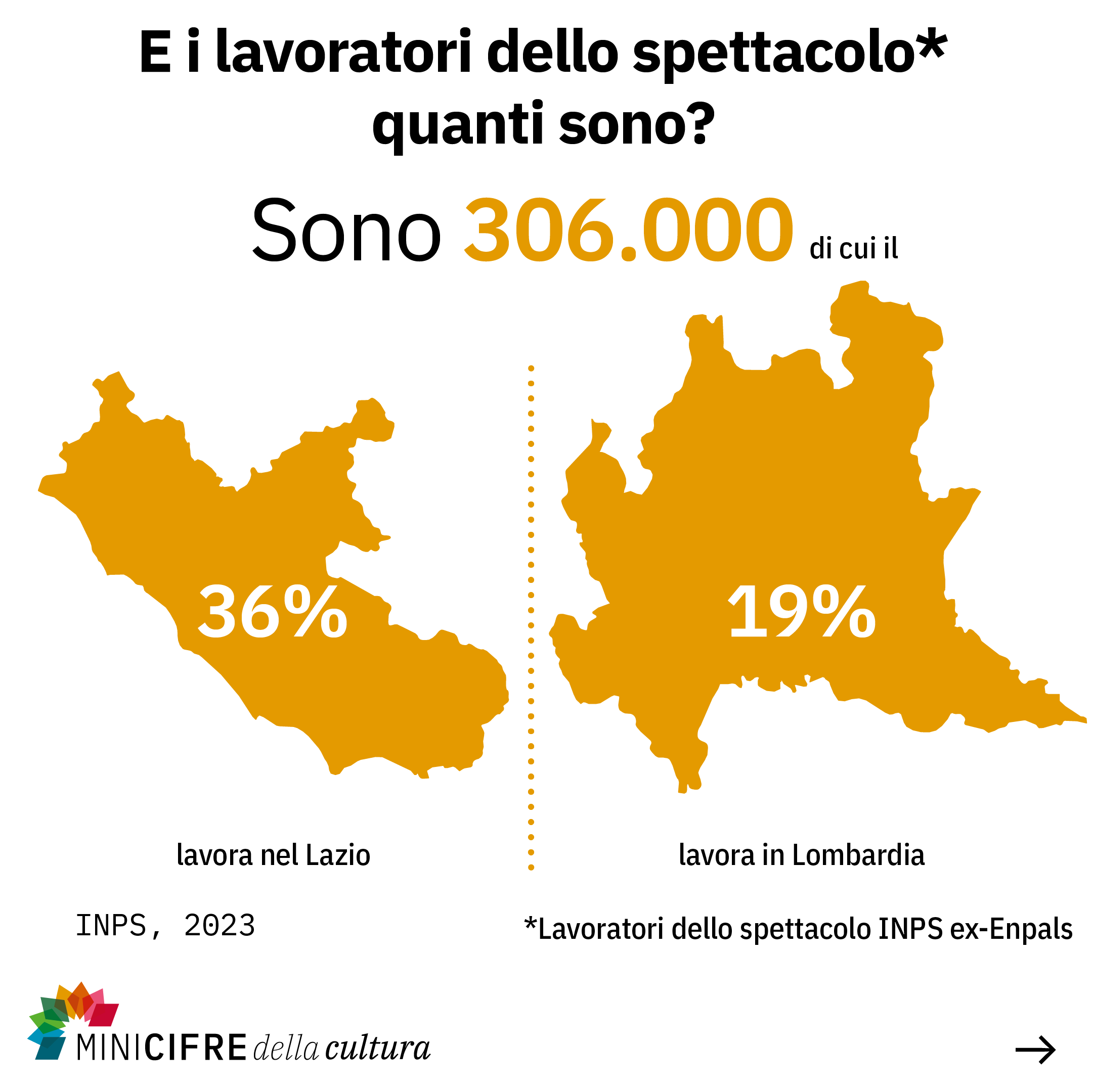 In base ai dati raccolti dall’osservatorio statistico dell’INPS, nel 2023 in Italia si contano 305.826 lavoratori dello spettacolo, il 18% in più rispetto al 2021. I gruppi professionali più rappresentati sono quelli degli attori (33%), degli impiegati (13%) e dei concertisti e orchestrali (12%). In termini geografici, invece, le regioni dove risiede il maggior numero di lavoratori dello spettacolo sono il Lazio (36%) e la Lombardia (19%). In media, per il 2023 sono circa 78 le giornate di lavoro retribuite all’anno per lavoratore (+6% dal 2021).